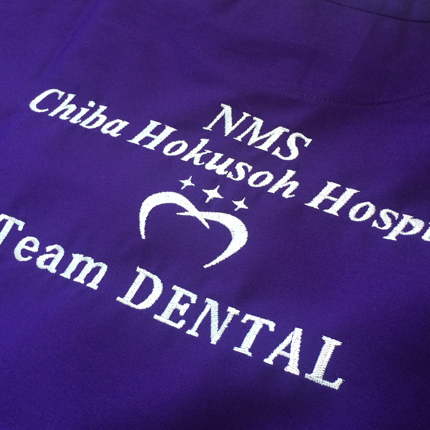 NMS / CHIBA HOKUSOH HOSPITAL Team Dental様より、ロゴ刺繍入りオリジナルスクラブのご依頼をいただきました。今回のロゴ刺繍は、校章とチーム名の2種類のデザインです。校章は、中央にツートーンカラ―で人物の横顔が描かれるなど、細部まで凝られたデザインでしたので、デザインをしっかり再現できるように刺繍糸の選定から注力して作業いたしました。また、エンブレムタイプの校章でしたので、立体感がでるように周囲に縁取りを付けています。背中のチーム名は、一般的にはプリントが用いられますが、リクエストをいただき、シルバー1色の刺繍で対応し、重厚感な雰囲気と光沢感を与えています。品格のある校章と、目映ゆいチーム名の組み合わせで素敵なオリジナルスクラブに仕上がりました。