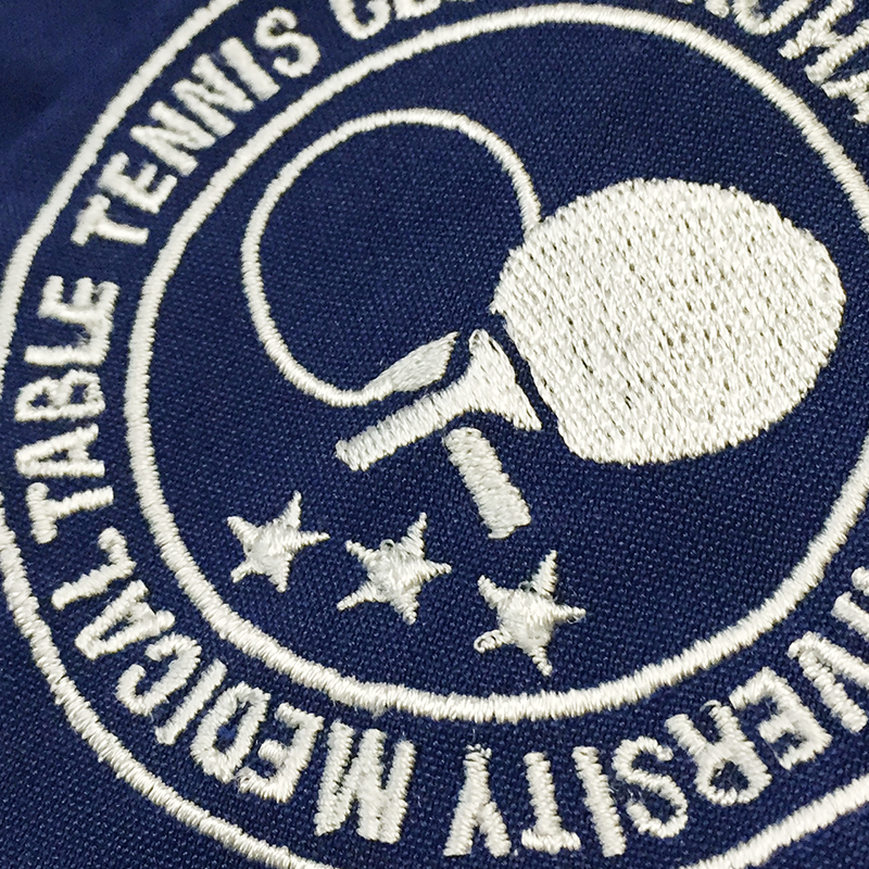YOKOHAMA CITY UNIVERSITY MEDICAL TABLE TENNIS CLUB 様より卓球部オリジナルのロゴ刺繍入りスクラブのご依頼をいただきました。今回のロゴは、交差するラケット、3つの星、サークル名を配したデザインです。卓球部を象徴するラケットは、チームの皆様のアイデアから、ラケットの裏表を表現するためにラケットの1つを塗りつぶし、もう片方をスクラブの生地にしたり、ラケットの種類には、先が丸みを帯びたシェークハンド型のラケットを採用いただきました。右袖には、チームの皆様、個々のネーム刺繍も施されています。チームを象徴するラケットを中心に、卓球部の皆様ならではのアイデアが活かされたオリジナルスクラブに仕上がりました。