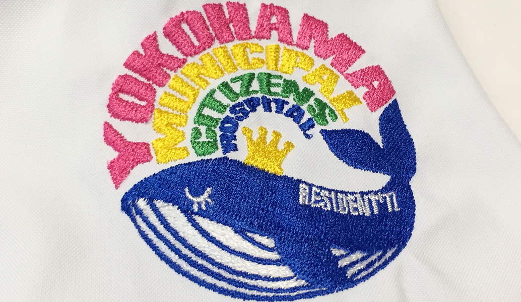 YOKOHAMA MUNICIPAL CITIZENS HOSPITAL様よりロゴ刺繍入りオリジナル白衣のご依頼をいただきました。今回のロゴ刺繍は、可愛らしいクジラのイラストとカラフルな文字が印象的なロゴマークです。キャラクターのクオリティによって品質が左右するデザインでしたので、クジラのお腹周りや、顔、しっぽ、王冠など、キャラクターの雰囲気が出るように注力して刺繍いたしました。原稿にはクジラの目にまつ毛はありませんでしたが、打ち合わせの過程で、リクエストをいただき、まつ毛を付け加えました。愛らしい表情のクジラが、カラフルな文字と共に素敵に映えるオリジナル白衣に仕上がりました。