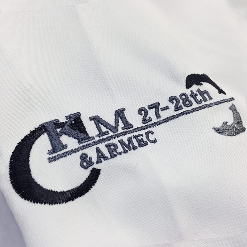 KMC & ARMEC 27-28th様よりロゴ刺繍入りオリジナル白衣のご依頼をいただきました。今回のロゴ刺繍は、スタイリッシュに描かれたチーム名と、水面を跳ねるイルカと、水面に映るイルカの影を表現したデザインです。刺繍の色は、ワインと赤や、ブラックとグレーなど、チームの皆様、それぞれお好みの色の組み合わせをお選びいただきました。お洒落な色使いとハイブリッドなデザインの融合したクールな白衣に仕上がりました。