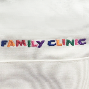 ドクターコートへのキャラクターのロゴ刺繍のご依頼をいただきました。キャラクターの可愛らしい雰囲気をそのまま再現するために、刺繍の糸の流し方や、糸の色の選定に最大限にこだわりました。特にキャラクターの目元や、口、鼻など、キャラクターの雰囲気を決定付ける部分と、キャラクターが身につけている白衣、聴診器、スリッパや、白衣に付随するボタンやポケットなどの細かい部分は、刺繍次第でキャラクターの印象を大きく変えるため細心の注意を払い刺繍を施しています。カラフルなFAMILY CLINICの刺繍は、いただいたデータにもとづいて忠実に色味を再現しました。今回のロゴ刺繍は、ドクターコートの左胸にあり、コートの衿元からキャラクターが顔を覗かせる、キャラクターの雰囲気通りの可愛らしいドクターコートに仕上がりました。