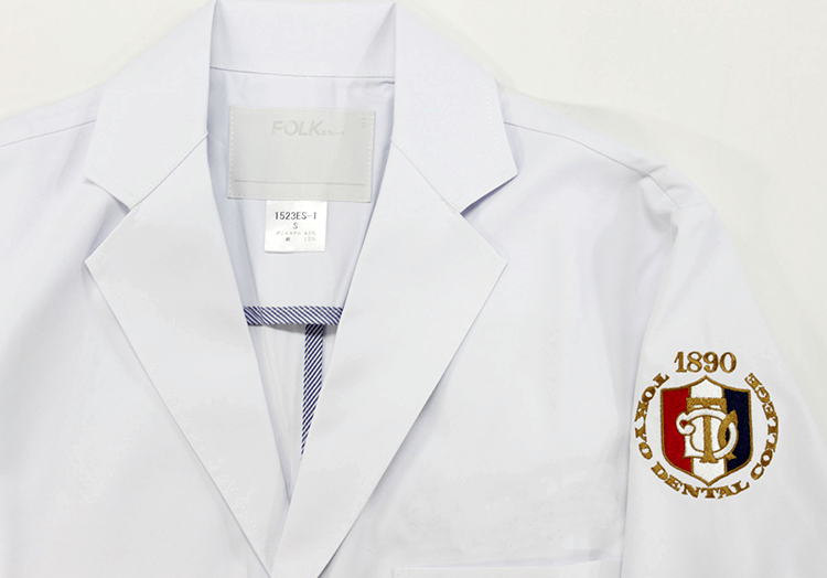 TOKYO DENTAL COLLEGE 1890様よりオリジナルのロゴ刺繍入り白衣のご依頼をいただきました。ロゴ刺繍は、校章のデザインです。校章の雰囲気を忠実に再現するために色はレッド、ホワイト、ダークネイビー、ダークゴールドの4色を使用しています。シンプルなデザインながらも、白地に校章が素敵に映えるロゴ刺繍入り白衣に仕上がりました。