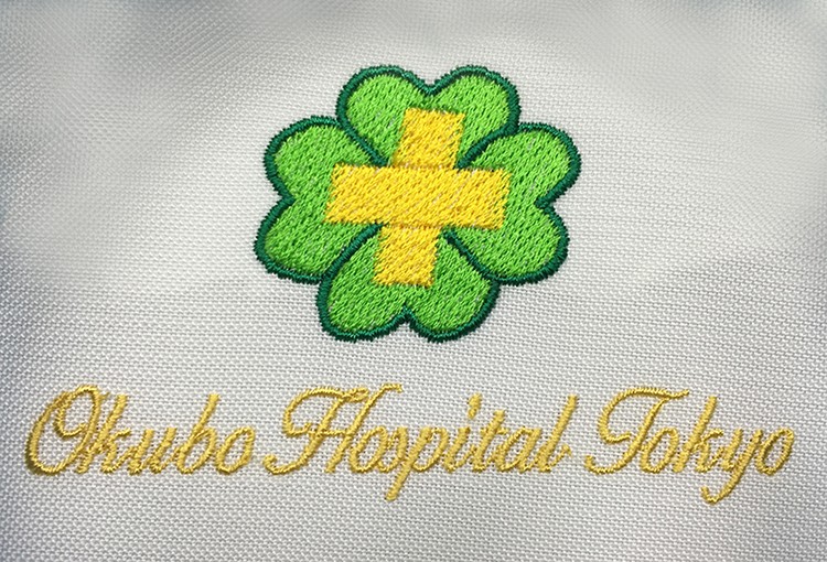 Okubo Hospital Tokyo様よりオリジナルのロゴ刺繍入り白衣のご依頼をいただきました。ロゴ刺繍のデザインは、ハートの葉っぱの4つ葉のクローバーとと十字架を組み合わせたデザインです。4つ葉のクローバには濃い緑で縁取りをつけることで、ハート型と分かるデザインにしています。また、十字架はあえて傾けて、四つ葉のクローバーとの一体感を出しています。病院名の部分にはエレガントなスクリプト書体を用い、マークの可愛さと、書体の美しさを合わせた可愛らしい白衣に仕上がりました。