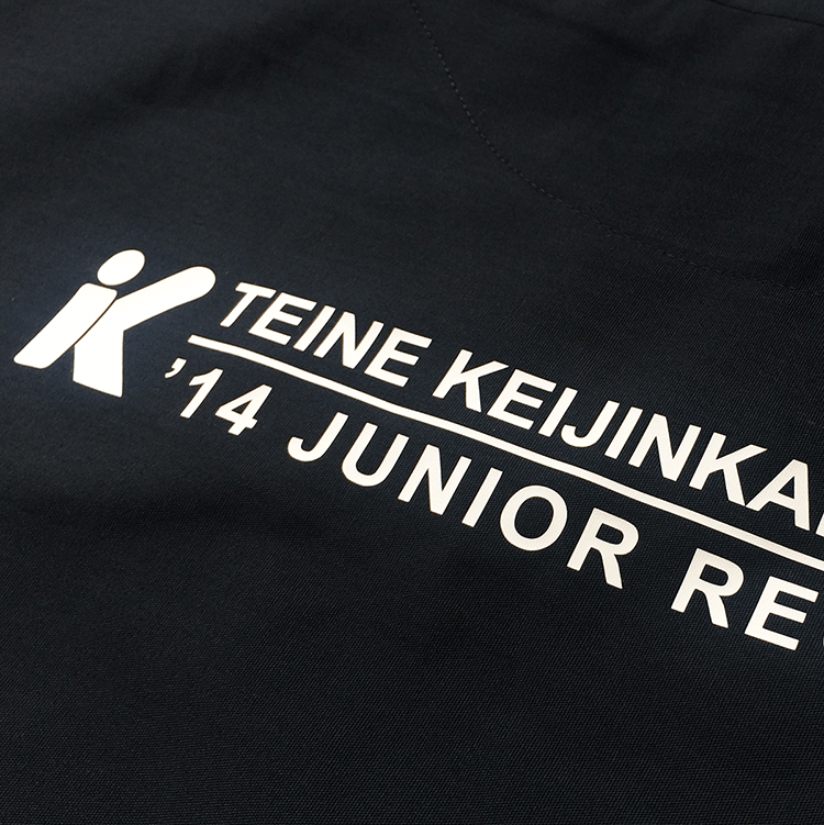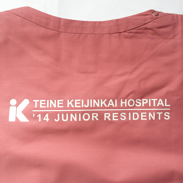 TEINE KEIJINKAI HOSPITAL '14 JUNIOR RESIDENTS様のオリジナルプリントスクラブを作成いたしました。デザインは、病院のロゴマーク・病院名・チーム名を組み合わせたデザインです。今回のデザインは、手書きの図案を元に当社にてアレンジいたしました。書体には、ロゴマークの丸みを帯びた雰囲気に合うようArialを採用。文字の太さと線の太さを均一にし、全体のバランスのとれたデザインに仕上げました。プリントは、ホワイト1色の単色プリントですが、スクラブは、カラーバリエーション豊富なフォーク社のスクラブを採用いただき、多彩なカラーの中から、皆様、思い思いのカラーをお選びいただき個性を表現いただきました。